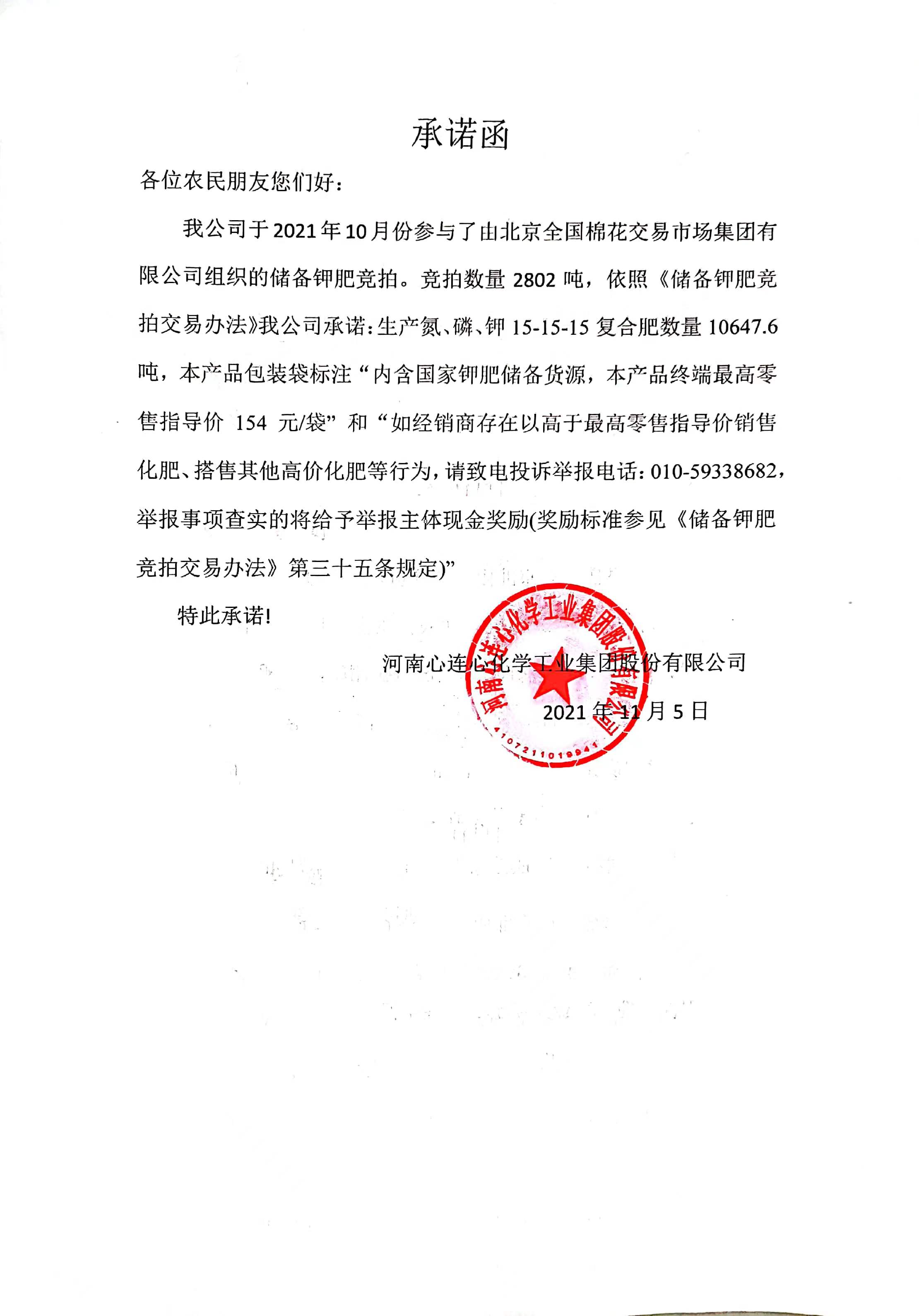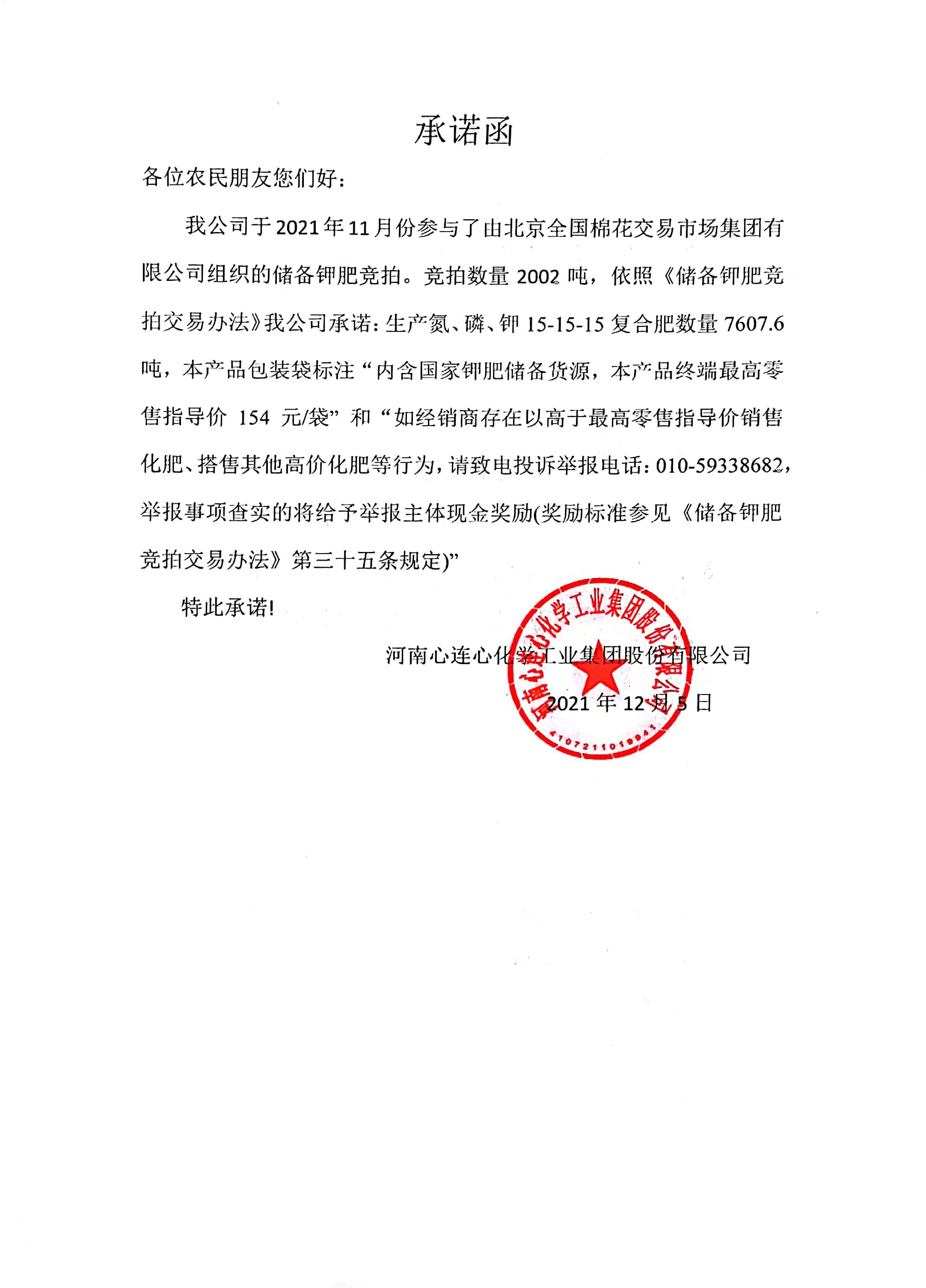 幸运飞行艇官方开奖查询国储钾肥竞拍承诺函--幸运飞行艇官方开奖查询(原河南心连心化肥有限公司)